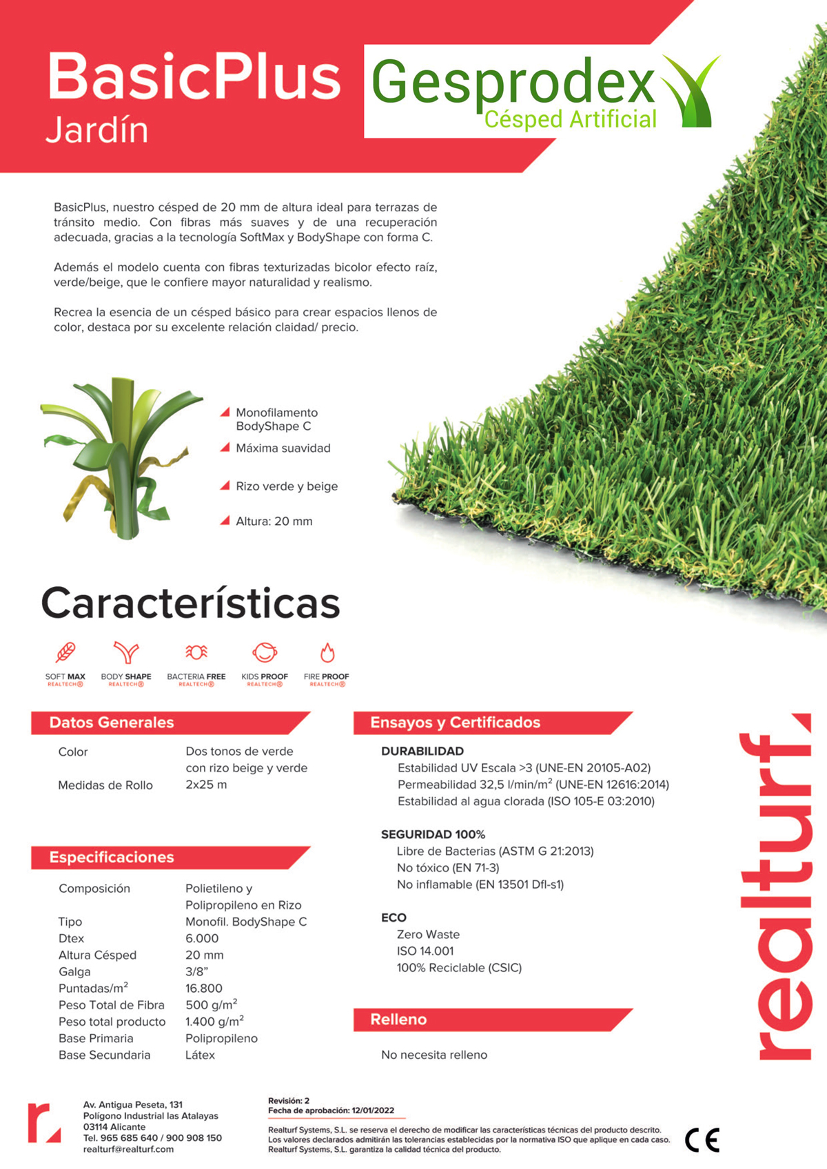 BasicPlus cuenta con la tecnología BodyShape en forma de C, que le permite recuperar su forma vertical de manera eficiente. Además, sus fibras texturizadas bicolor con efecto raíz en verde y beige le dan un aspecto natural y realista.
