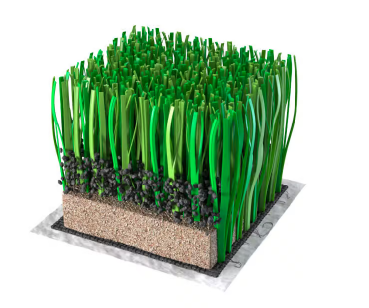 La base del sistema es el triple backing, fabricado con doble capa de polipropileno (PP) y una tercera capa de malla entrelazada para garantizar la estabilidad dimensional de la base. La capa de sellado de látex garantiza la resistencia a arranque por tracción de 50 N.