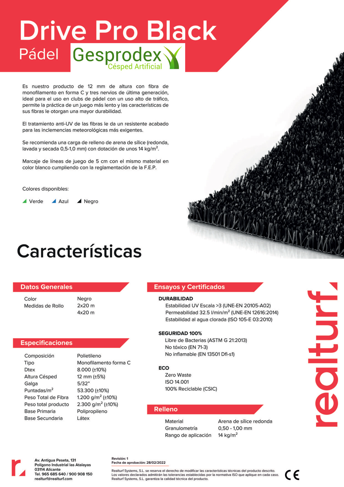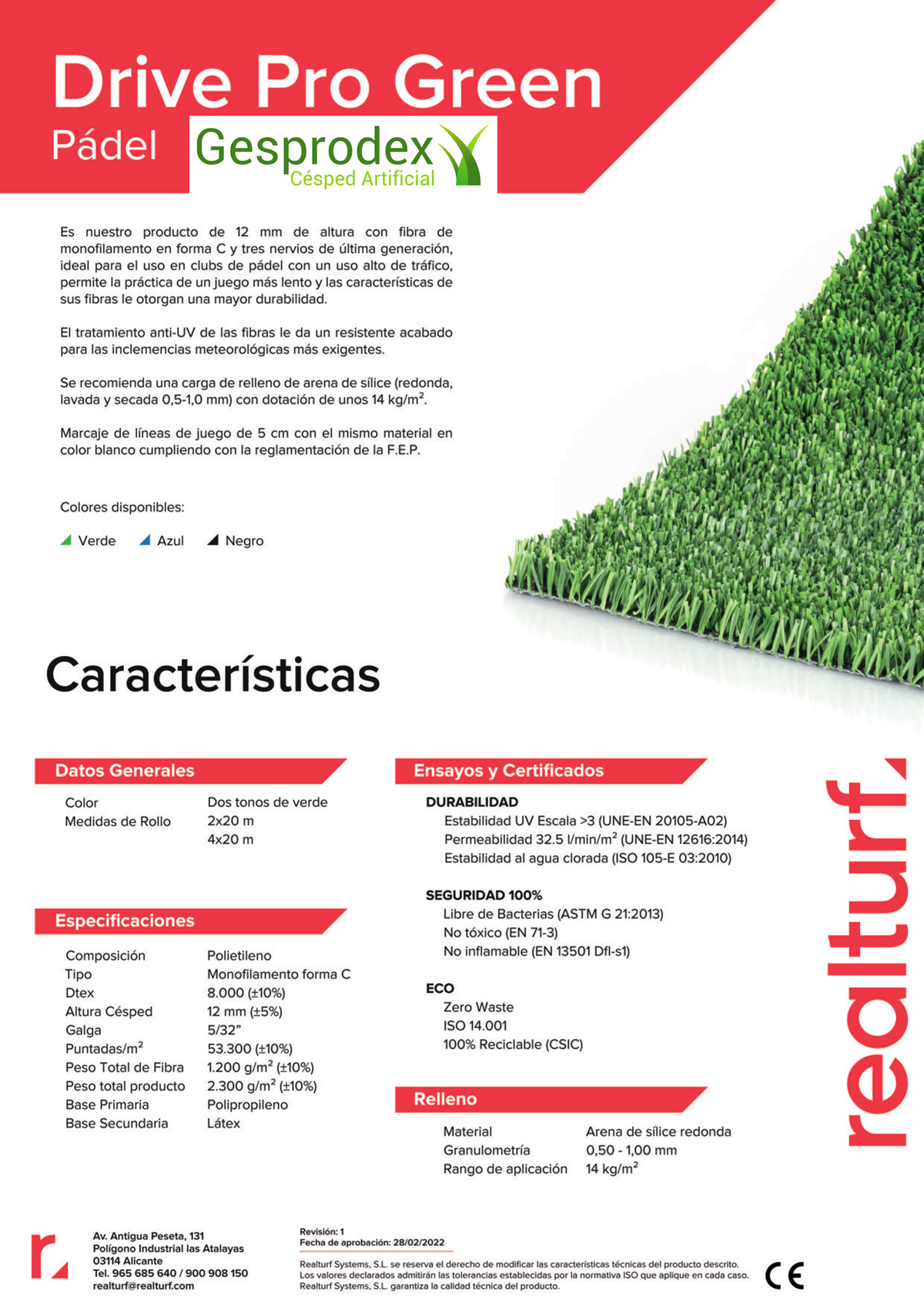 El césped artificial DrivePro está diseñado especialmente para clubes de pádel con un tráfico alto de jugadores. Con una altura de 12 mm, este césped cuenta con fibras de monofilamento en forma de C y tres nervios de última generación que le otorgan una mayor durabilidad y resistencia al uso.