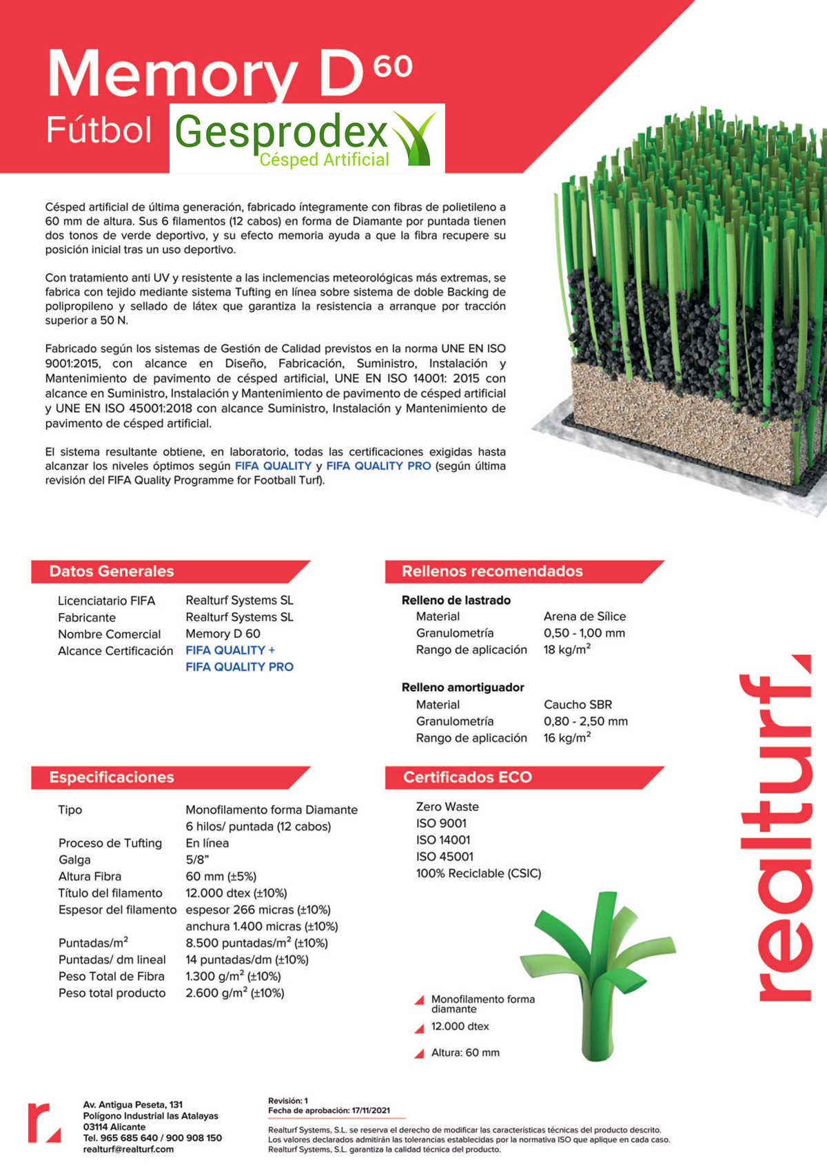 MEMORY D60, césped artificial de última generación, fabricado íntegramente con fibras de Polietileno (PE) a 60mm de altura, sus seis filamentos (12 cabos) en forma de Diamante por puntada tienen dos tonos de verde deportivo, y su efecto memoria ayuda a que la fibra recupere su posición inicial tras un uso deportivo.
