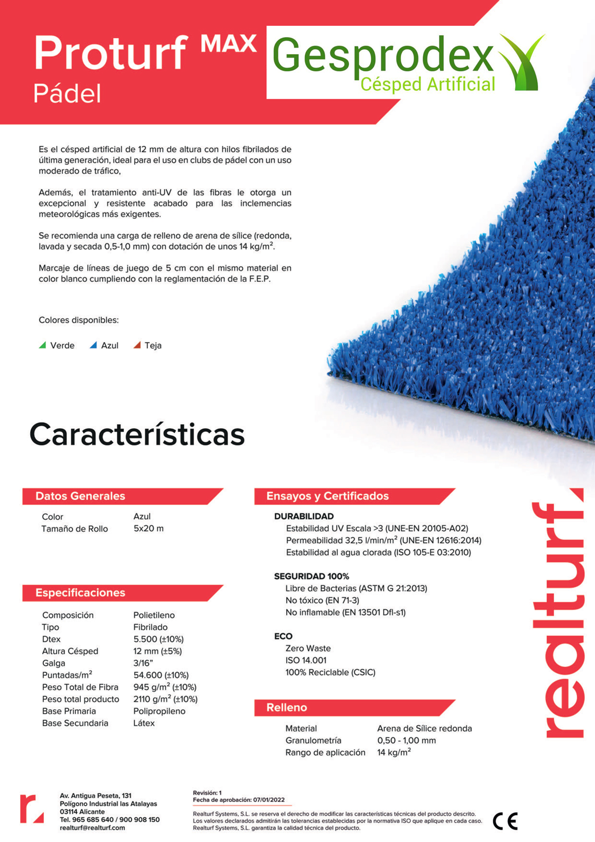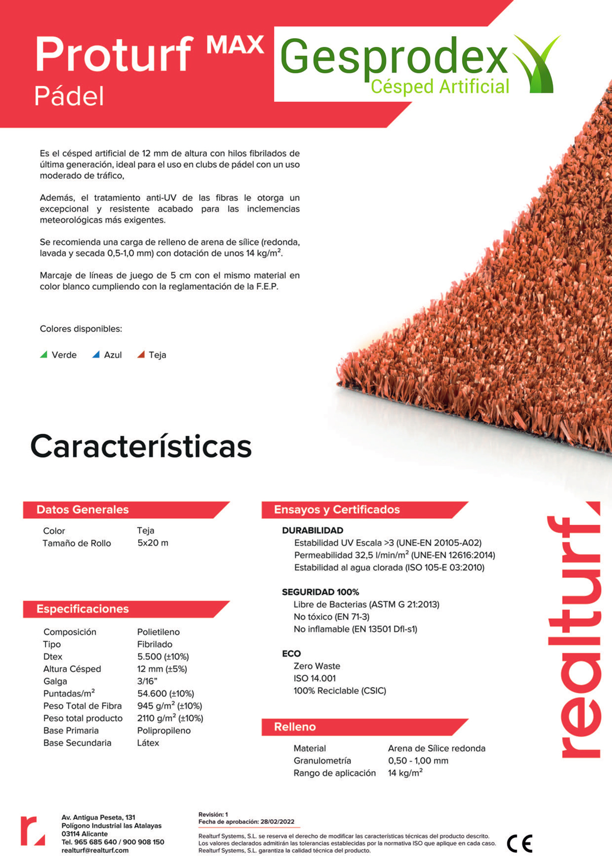Este producto está fabricado mediante el sistema tufting en línea, con una galga de 3/16 de pulgada entre líneas de puntada, lo que resulta en una densidad de 54,600 puntadas por metro cuadrado y un peso total de 2,110 g/m². Además, las fibras cuentan con un tratamiento anti-UV, que garantiza una mayor resistencia frente a las inclemencias meteorológicas más exigentes.