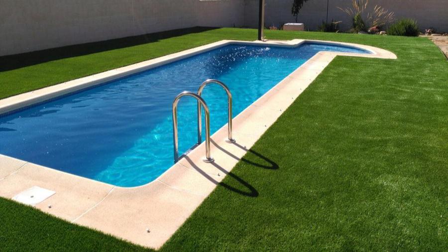 Instalación de césped artificial alrededor de piscina en Chalet Toledo