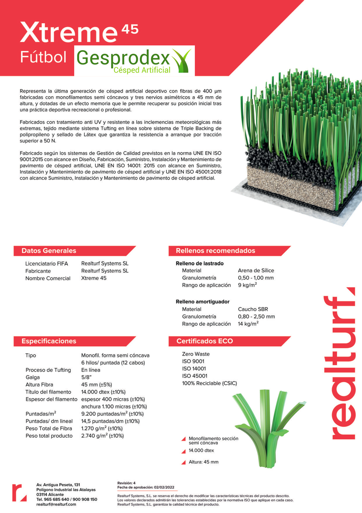 REALTURF XTREME 45 césped artificial de última generación de 45 mm de altura fabricado con seis monofilamentos (12 cabos) de polietileno por puntada, con tres nervios asimétricos semi cóncavos con efecto memoria y un bitono verde deportivo.