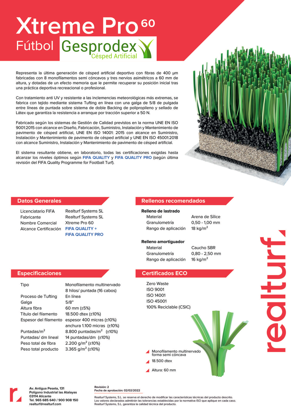 XTREME PRO 60 es nuestro pavimento de césped artificial de última generación de 60 mm de altura fabricado con monofilamentos semi cóncavos, 100% Polietileno (PE), con tres nervios asimétricos efecto memoria y un bitono verde deportivo.
